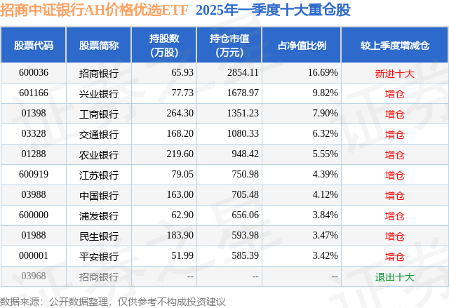 从基金规模来看众盈易配,招商中证银行AH价格优选ETF基金2025年一季度公布的基金规模为1.71亿元,较上一期规模1.07亿元变化了6422.19万元,环比变化了60.12%。该基金最新一期资产配置为:股票占净值比99.4%,无债券类资产,现金占净值比2.34%。从基金持仓来看,该基金当季前十大股票仓位达65.52%,第一大重仓股为招商银行(600036),持仓占比为16.69%。