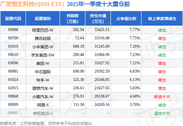 从基金规模来看,广发恒生科技(QDII-ETF)基金2025年一季度公布的基金规模为43.01亿元,较上一期规模35.44亿元变化了7.58亿元,环比变化了21.38%。该基金最新一期资产配置为:股票占净值比91.54%,无债券类资产,现金占净值比7.63%。从基金持仓来看,该基金当季前十大股票仓位达63.67%,第一大重仓股为阿里巴巴-W(09988),持仓占比为7.77%。